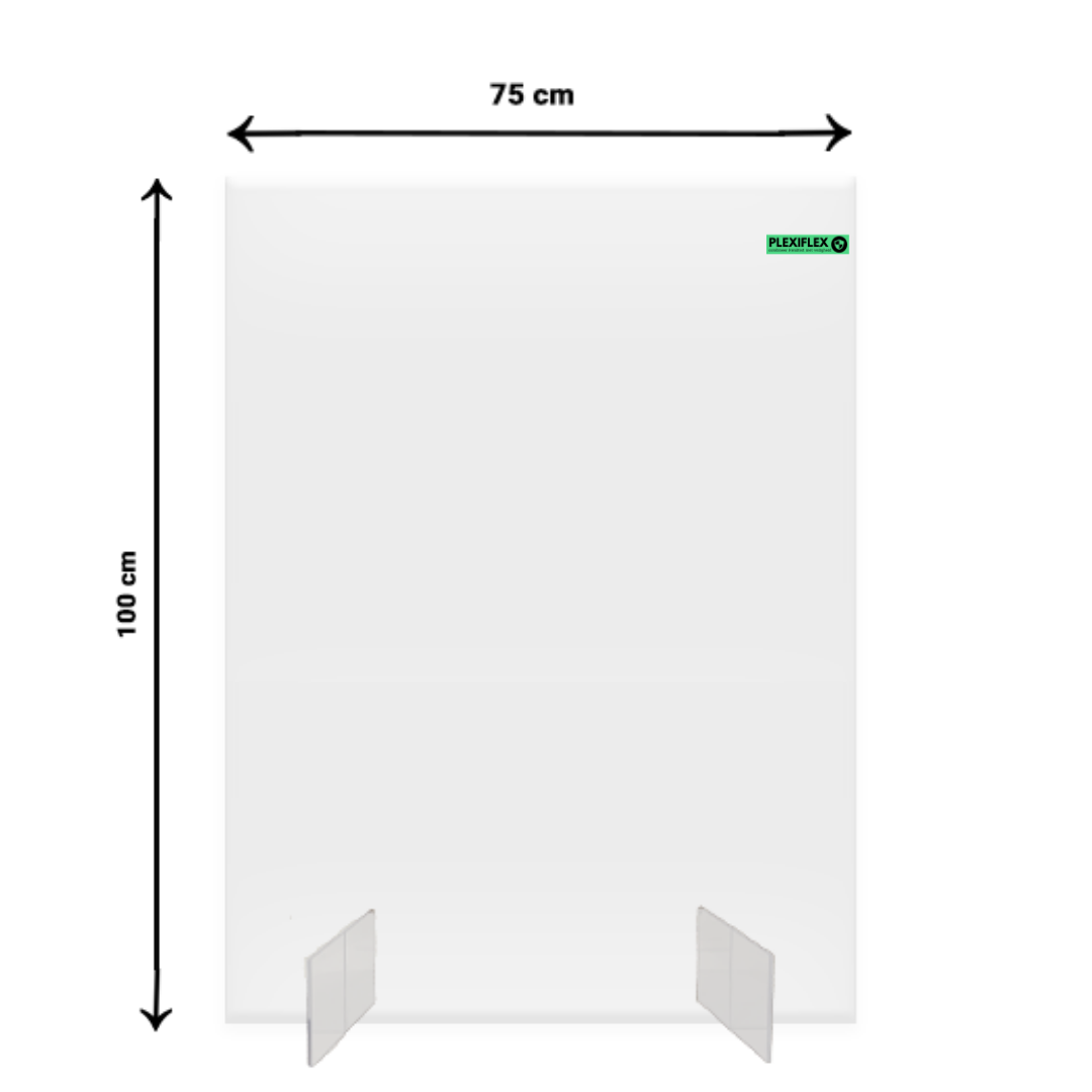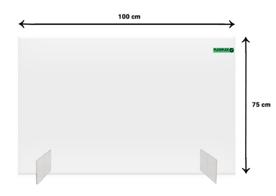 Het PlexiFlex spatscherm bestaat uit drie onderdelen, één 4mm plexiglas plaat in de maat 75 x 100 cm en twee staanders van 20 x 10 cm. In deze plexiglas staanders kunt u de plaat vastzetten en blijft de scheidingswand stevig staan.